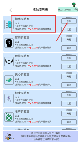 4、在实验室列表中选择【情商实验室】,花费【¥20,000】点击【升级】,提升其改造成功率以增加情商属性。