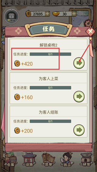 1、查看任务列表,【解锁桌椅2】任务进度为0/1,完成后可获得【+420】货币奖励,点击箭头可查看任务指引。