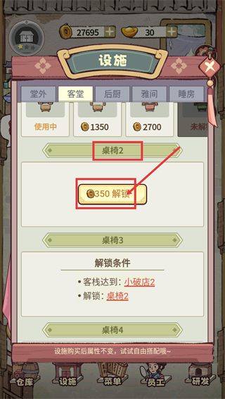 2、进入【设施】界面的客堂分类,消耗【350】货币解锁【桌椅2】,满足任务条件推进进度。
