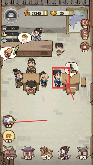 3、回到客堂界面,响应客人的【点菜】需求,后续可进行上菜操作,推进【为客人上菜】任务。