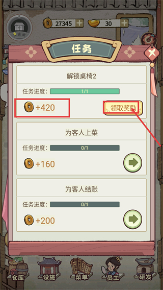 4、【解锁桌椅2】任务进度达成1/1,点击【领取奖励】获取【+420】货币,继续推进其他任务。