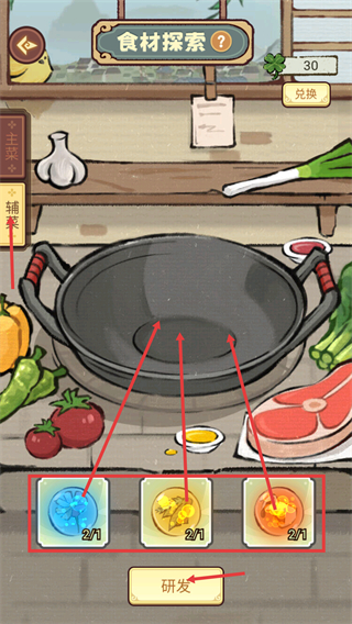 1、在【食材探索】界面切换到【辅料】分类,集齐底部显示的材料(如2/1类)后,点击【研发】按钮可尝试制作新菜品。