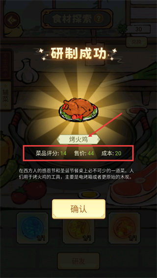 2、研制成功后查看【烤火鸡】的属性:菜品评分-14、售价-44、成本-20,确认后该菜品会加入可经营列表。