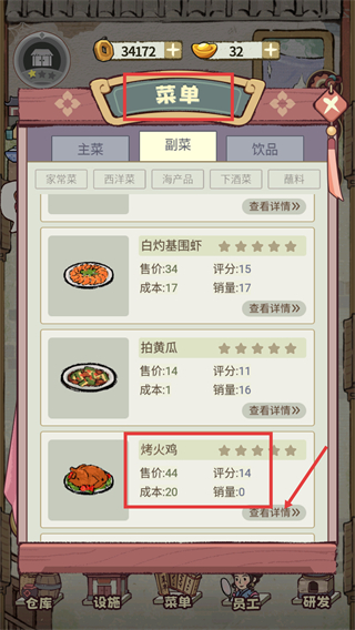 3、进入【菜单】的【副菜】分类,找到新研制的【烤火鸡】,可查看其售价、评分等信息,此时它的初始销量为0。