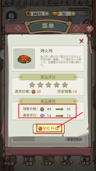 4、点击【烤火鸡】的查看详情,消耗【500】金币点击【升级】,可提升其销售价格-46与美食评分-19,增强盈利能力。