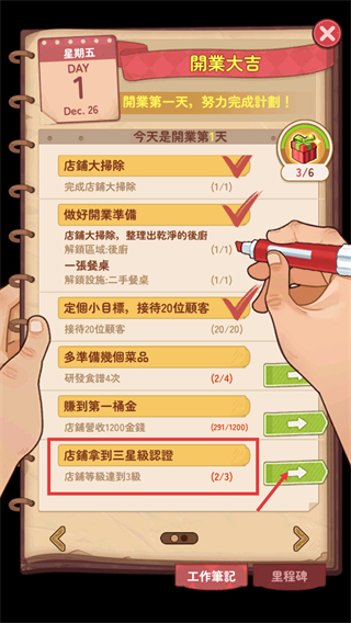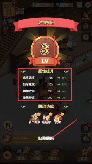 4、店铺升级至【3-LV】,来客速度等属性得到提升,同时开启新功能,完成三星级认证的相关进度。