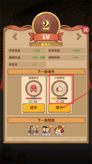 2、在店铺等级界面,针对【口味评分-10/28】点击“提升”按钮,推进店铺升级所需的条件达成。
