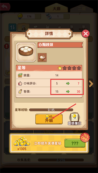 3、进入【白面馒头】的菜品详情界面,点击“升级”按钮,提升其口味评分-5→7与售价-15→30,助力口味评分达标。