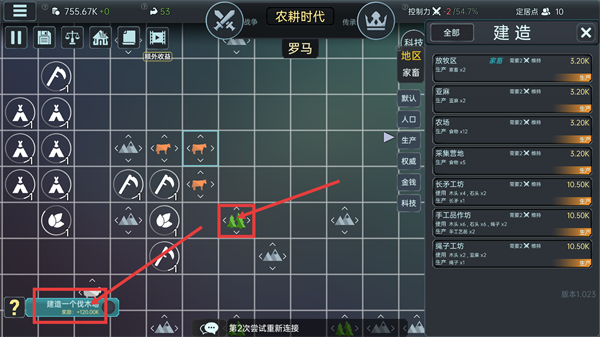 1、在罗马文明的农耕时代,跟随指引建造【伐木场】,消耗对应资源完成建造后,可获得【120.00K】的奖励,同时生产木头资源。