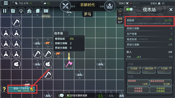 2、建造【伐木场】后,留意其【控制率】状态,控制率高于50%会增加产能,可通过合理布局建筑维持高控制率以提升生产效率。