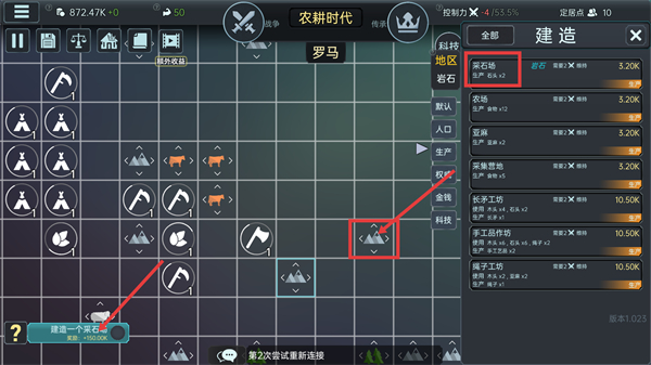 3、完成伐木场建造后,跟随指引建造【采石场】,消耗对应资源建造于岩石区域,完成后可获得【150.00K】奖励并生产石头资源。