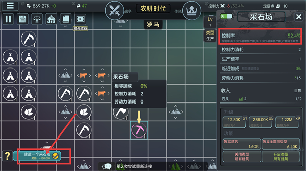 4、【采石场】的控制率同样影响产能,需保持控制率高于50%,同时可通过升级建筑进一步提升石头的生产收益与建筑等级。