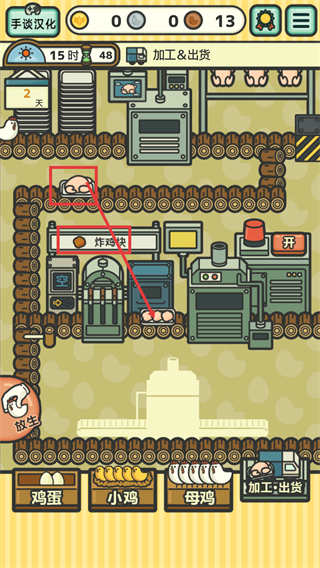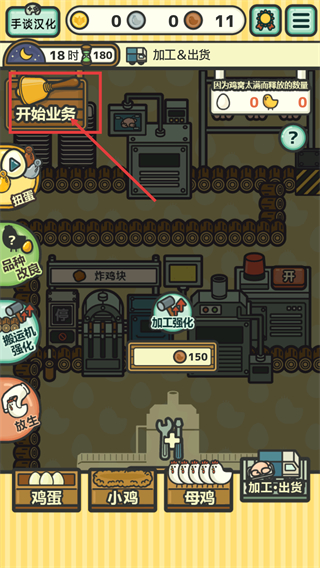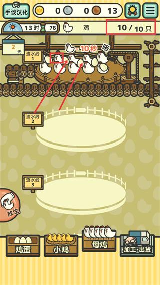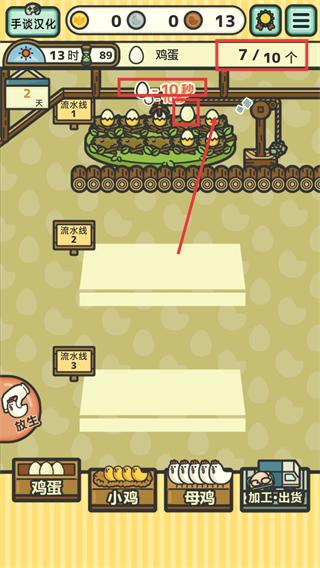2、【鸡蛋-7/10个】在【流水线1】中,每个鸡蛋的孵化耗时为【10秒】,积累鸡蛋可推进小鸡产出。