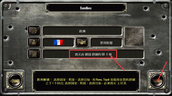 1、进入【Sandbox】界面,选定【欧洲】-【法国】,需完成【消灭由德国控制的50个师】的任务,同时留意胜利解锁的后续目标。