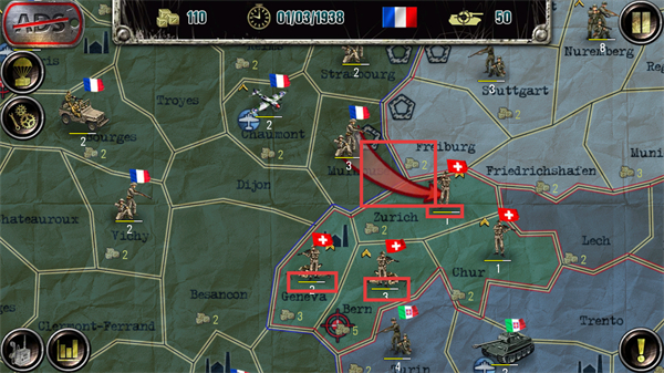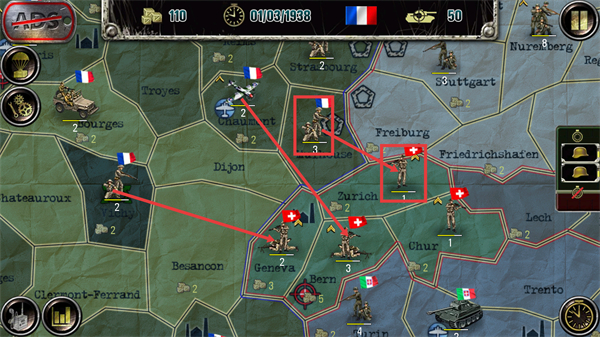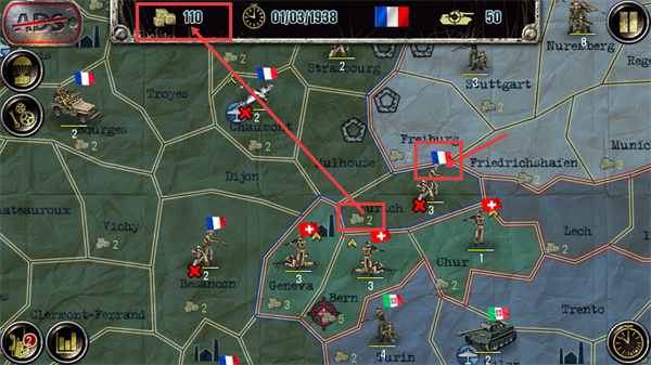 2、在【01/03/1938】的法国地图中,观察【3-己方单位】与周边【1-敌方单位】的分布,明确当前区域的兵力部署态势以做推进准备。