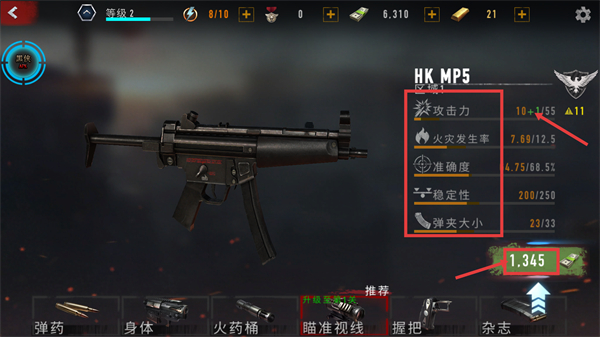 1、升级【HK-MP5】的【瞄准视线】需消耗【1345-货币】,提升其【攻击力】【稳定性】等属性,强化战斗输出效率。