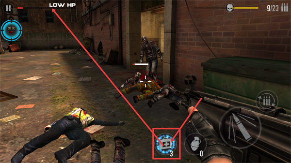 3、出现【LOW-HP】血量警告时,立即使用【急救包-3】恢复生命值,优先消灭带血条的高威胁僵尸,稳固战局。