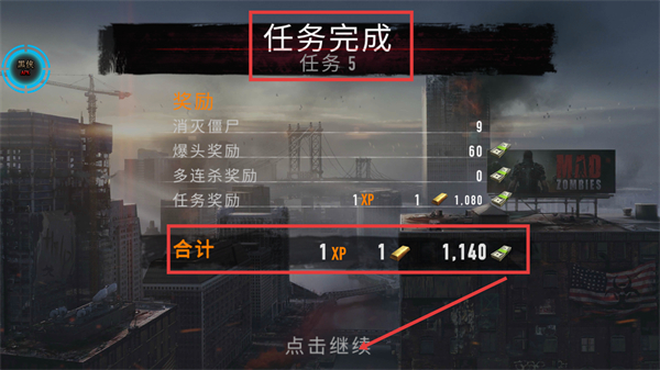 4、完成【任务-5】后可获取【1-XP】【1-金币】【1140-货币】,点击【点击继续】领取奖励并推进后续任务。