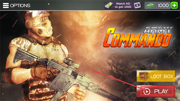 1、进入【ARMY-COMMANDO】时点击【PLAY】启动游戏,可通过【Watch-AD-to-get-1000】或【LOOT-BOX】获取资源,为战斗做准备。