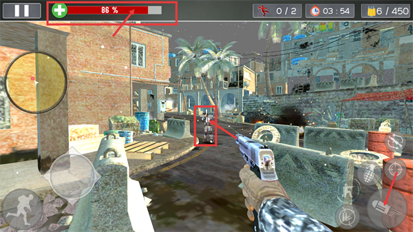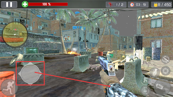 2、战斗中通过【移动摇杆】调整站位,留意【弹药-8/450】与【时间-03:51】,借助场景掩体规避敌方攻击。