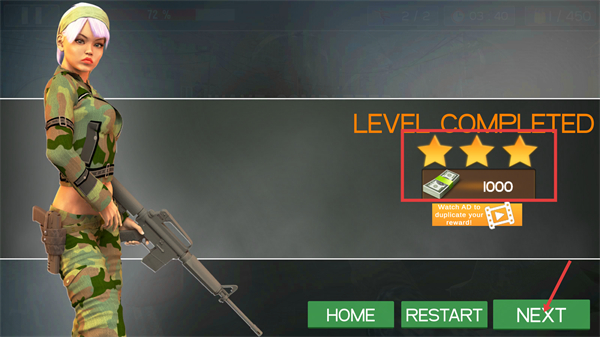 4、关卡完成获得【三星奖励】与【1000-货币】,点击【NEXT】进入下一关,也可看广告翻倍当前奖励。
