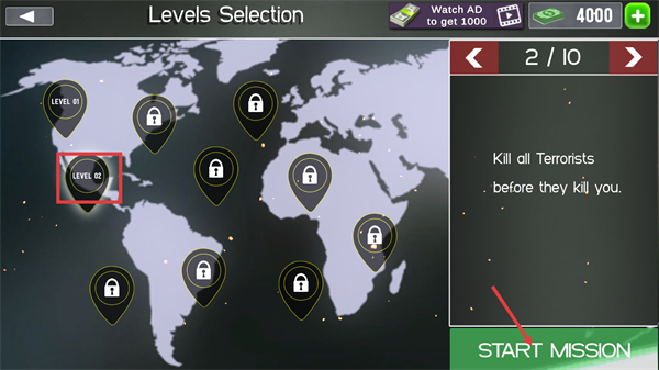 1、在关卡选择界面选中【LEVEL-02】,任务为【Kill-all-Terrorists-before-they-kill-you】,点击【START-MISSION】启动当前关卡战斗。