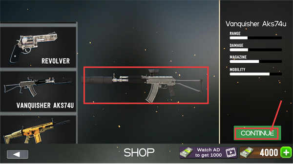 2、在商店界面选择【Vanquisher-Aks74u】武器,其属性适配当前战斗需求,点击【CONTINUE】确认选择并进入战斗。