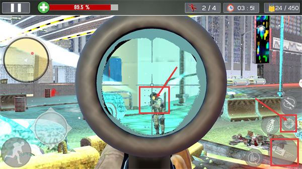 3、战斗中启用【瞄准功能】锁定敌方目标,推进【2/4-击杀进度】,同时留意【89.5%-血量】与弹药余量,灵活调整站位。