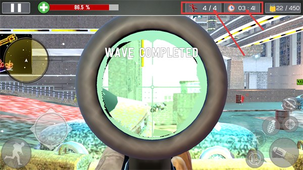 4、完成【4/4-击杀进度】后触发【WAVE-COMPLETED】提示,确认波次战斗结束,可准备衔接后续关卡内容。