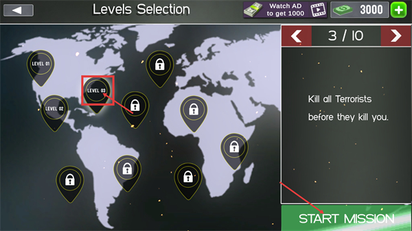 1、进入【Levels-Selection】界面,当前进度【3/10】,选中【LEVEL-03】后,遵循提示,点击【START-MISSION】开启该关卡任务。