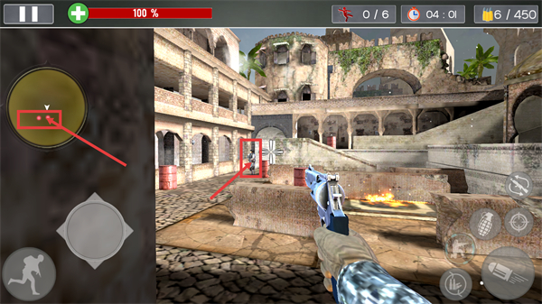 2、进入战斗场景,留意生命值【100%】、击杀进度【0/6】、剩余时间【04:01】与弹药【6/450】,通过瞄准镜锁定敌人进行射击推进进度。
