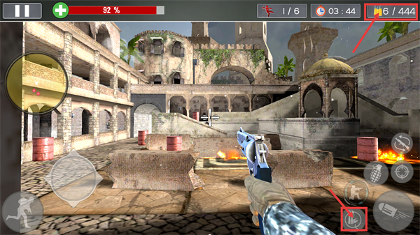 3、战斗中生命值降至【92%】,击杀进度【1/6】,剩余时间【03:44】、弹药【6/444】,利用操作按钮调整状态,继续消灭剩余敌人。