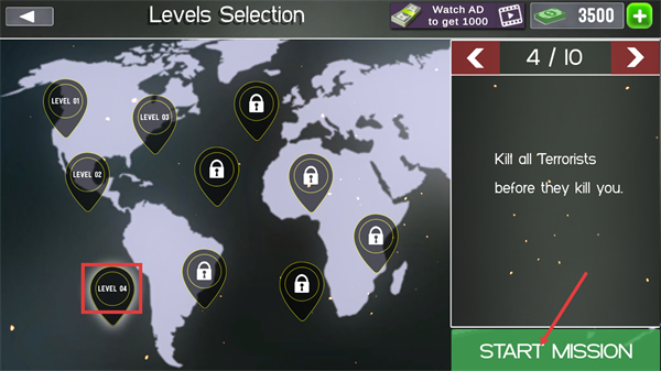 4、进入【Levels-Selection】界面,当前进度【4/10】,选中【LEVEL-04】后,点击【START-MISSION】启动该关卡。