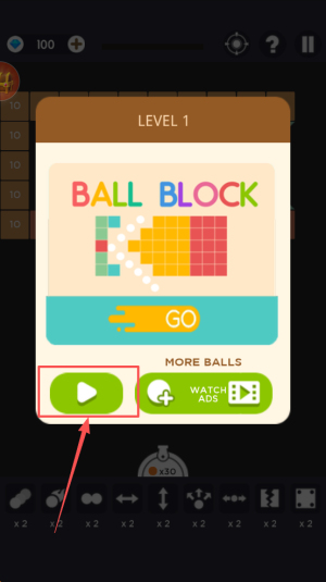 3、开始游戏:在关卡界面,点击“LEVEL 1”按钮,查看初始球数,点击“GO”开始弹球挑战。