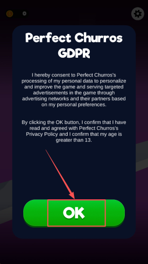 1、进入游戏:首先打开游戏主界面,点击“OK”按钮同意隐私政策,正式进入游戏。