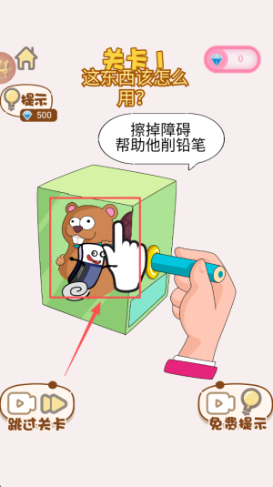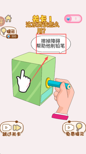 3、开始游戏:在关卡界面,点击“擦掉障碍”按钮,帮助角色削铅笔,完成关卡任务。
