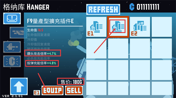 1、在格纳库中选择【F9量产型扩充插件E】,点击【EQUIP】装备,其【钻头攻击倍率+4.7%】【投弹充能倍率+4.8%】可增强战斗表现。