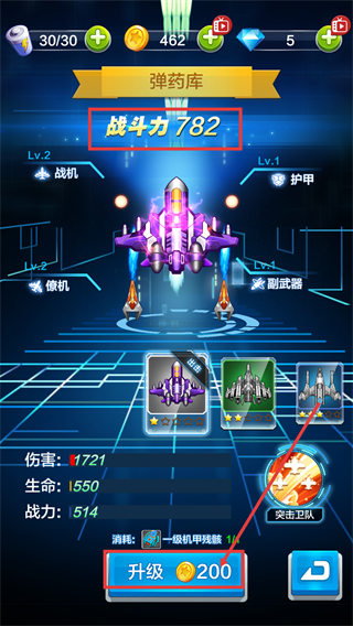 1、在弹药库界面消耗【200-金币】与【一级机甲残骸】升级战机,提升【战斗力-782】等属性,强化战斗能力。