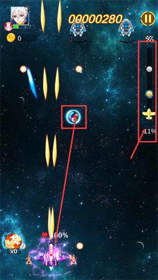 2、战斗中拾取场景内的道具,关注【11%-关卡进度】,操控战机躲避弹幕同时输出,推进关卡进程。
