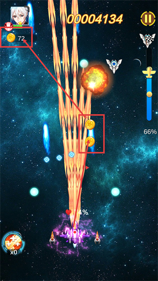 3、战斗时收集场景中的金币,留意【66%-进度】,在躲避密集弹幕的同时维持输出,向关卡完成推进。