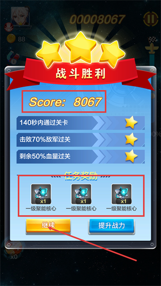 4、达成战斗胜利后获得【Score-8067】与三星评价,领取【一级聚能核心】奖励,点击【继续】进入后续环节。
