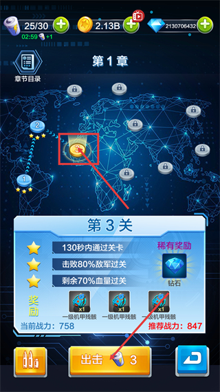 1、进入第1章第3关,消耗3点体力点击【出击】,目标达成130秒内通关等条件,可获【一级机甲残骸】奖励。