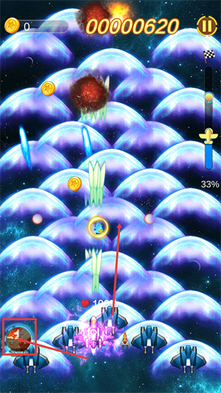 2、战斗处于【33%-关卡进度】,拾取场景道具,操控战机躲避弹幕同时收集金币,维持满血量推进关卡。