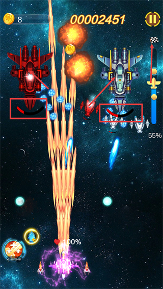 3、关卡进度达【55%】时,瞄准敌方战机血条区域输出,躲避密集弹幕同时收集金币,保持战力优势。