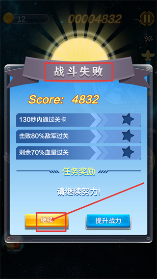 4、出现【战斗失败】时,可点击【继续】重试关卡,或选【提升战力】强化战机属性后再挑战。