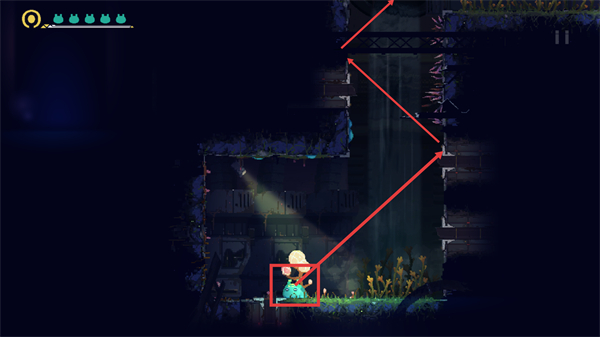 1、操控【蓝色小生物】沿箭头所示的多层平台路径移动,注意跳跃节奏避免坠落,推进至上层区域。