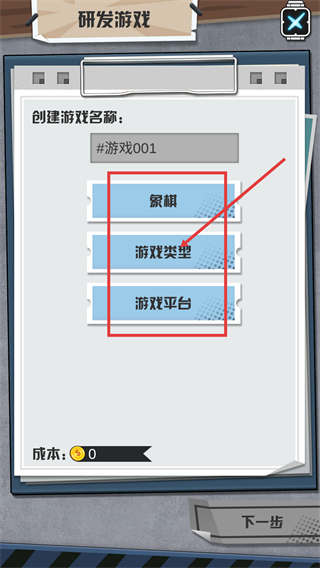 2、在研发界面选择【游戏类型】【游戏平台】等选项,确认后点击“下一步”推进。