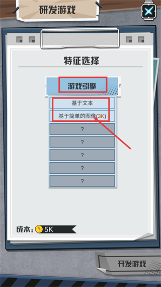 3、在特征选择界面,消耗5K金币选择【基于简单的图像(3K)】的【游戏引擎】,提升研发质量。