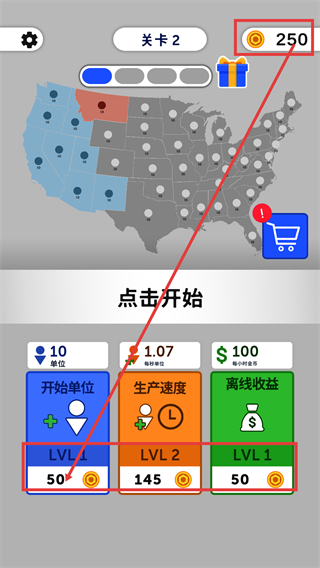 1、消耗50金币升级【开始单位-LVL1】,提升初始势力规模,点击【点击开始】进入关卡。