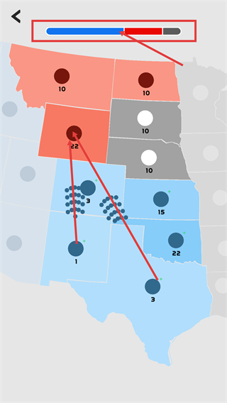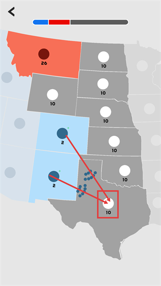 2、优先点击标有【10】的区域,快速扩张己方势力,同时避开敌方高数值区域。